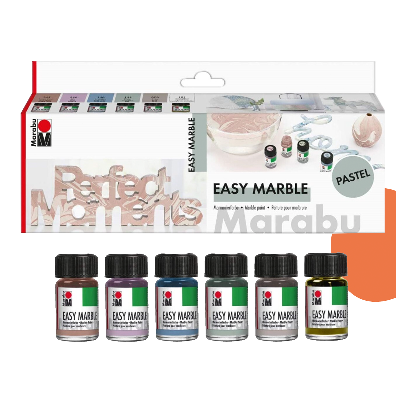 A Marabu Easy Marble egy különleges, 6 darabos márványozó festékkészlet, amellyel egyedi, márványhatású dekorációkat készíthetsz — nemcsak sík felületeken, hanem üvegen, műanyagon, fán, papíron, kerámián és akrilon is.